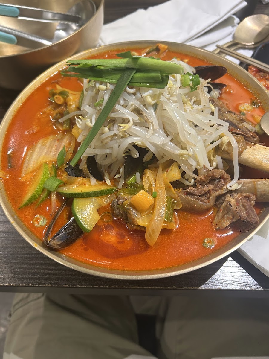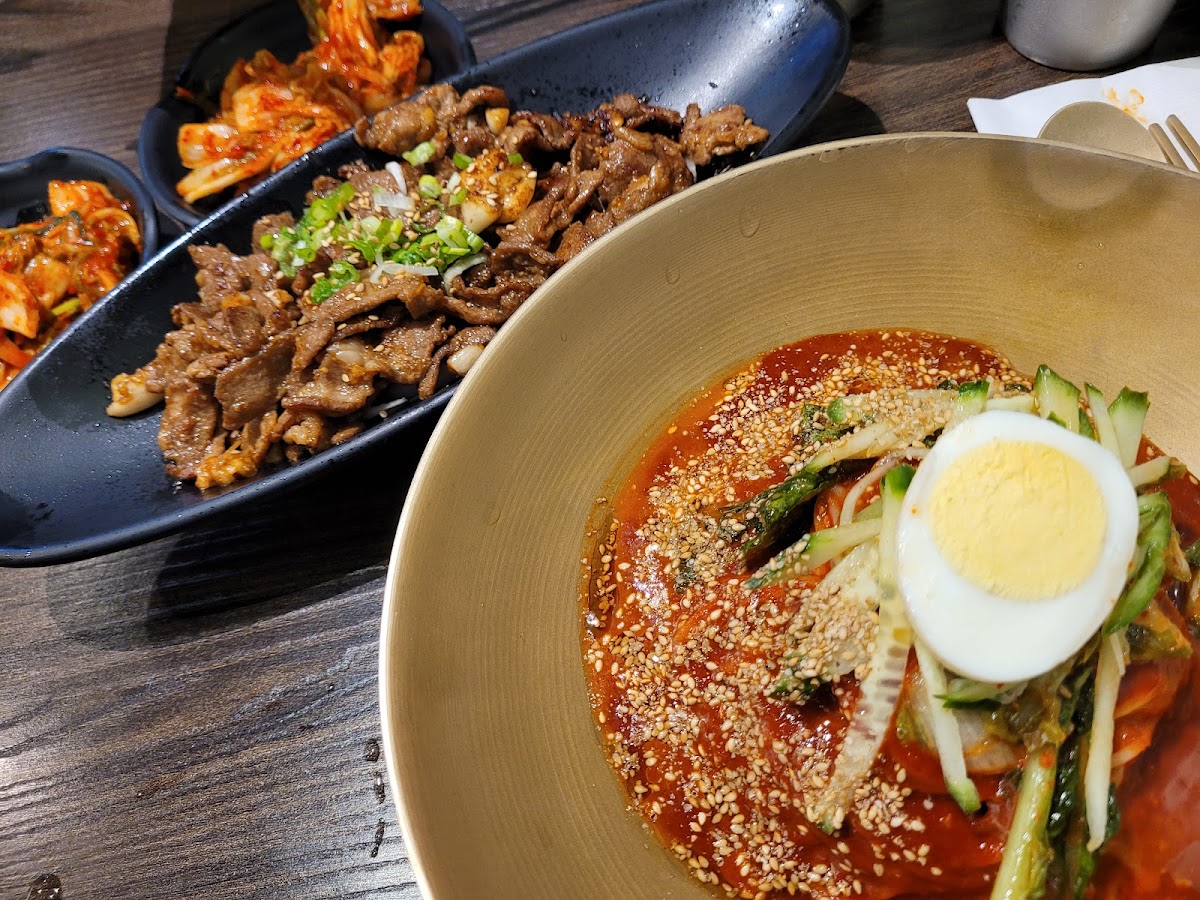 UPDATE 7/06/2024: We went back during lunch. It wasn’t crowded so the service was wonderful. Our food was good. However, they put the cart of all the dirty dishes next to us. I know this place is tiny, but I hope they rectify this and put it elsewhere, away from the customers eating. Overall, we will definitely return. ———— We were looking forward to some good Korean food as I was craving noodles. The pictures of this restaurant looked really appealing on Google. Inside, it was tiny but had cute decor. As soon as we sat down, the waiter told us to use the self-ordering system on the table, which I thought was pretty cool. However, the tablet was really slow. My husband ordered the galbi, which came on top of clear glass noodles. It was a huge portion and came out quickly, but it was tasteless and chewy. They only offered one side of kimchi banchan, which was disappointing because every other Korean restaurant I've been to offers at least four banchan. I ordered the spicy cold noodle soup, but it never arrived. After waiting for almost 30 minutes, I decided to cancel the order. This restaurant looked promising, but I'm giving it 1 star right now because the galbi was chewy and flavorless, and they only provided one side of banchan. I plan to return to try their noodle dishes and will update my review then.